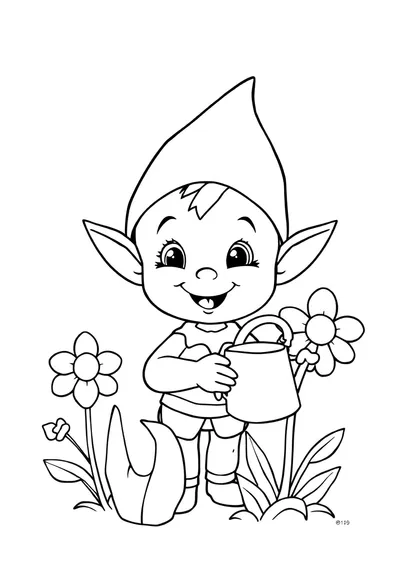Browse all 21 Fantasy pagesUnleash imagination with this adorable fantasy coloring page! It features a cheerful, cute cartoon baby elf with big friendly eyes, a pointy hat, and a bright smile, gently watering an oversized, whimsical flower using a tiny, star-shaped watering can. Designed with simple, bold lines, this easy-to-color illustration is perfect for young kids who love magical creatures and enchanting scenes.