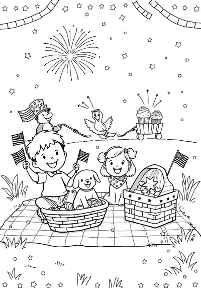 Browse all 17 Holidays pagesGet ready to celebrate with this delightful Fourth of July coloring page! This joyful cartoon scene features happy kids, a friendly dog, and festive fireworks, perfect for all ages. Its simple, charming style makes it an easy and fun activity to enjoy during your Independence Day festivities.