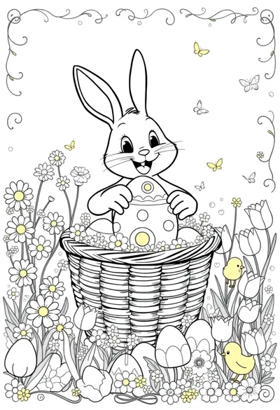 Este encantador dibujo presenta a un alegre conejito de Pascua de dibujos animados, sonriendo cálidamente mientras coloca con cuidado un huevo decorado en una cesta desbordante. Ambientado en un vibrante jardín primaveral, este diseño encantador y fácil de colorear es perfecto para que niños y familias den vida a la magia de la festividad con su propio toque creativo.