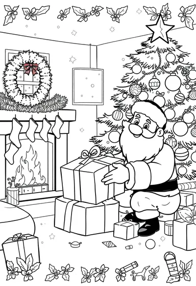 Explorar las 27 páginas de FestividadesSumérgete en el espíritu navideño con esta encantadora página para colorear de Navidad, que presenta a un alegre Papá Noel de dibujos animados ocupado en Nochebuena. Esta escena fácil de colorear muestra a Papá Noel colocando suavemente un hermoso regalo bajo un árbol festivo en una acogedora sala de estar, perfecta para que disfruten todas las edades. Es una actividad atractiva que da vida a la magia de la temporada con sus encantadores detalles.